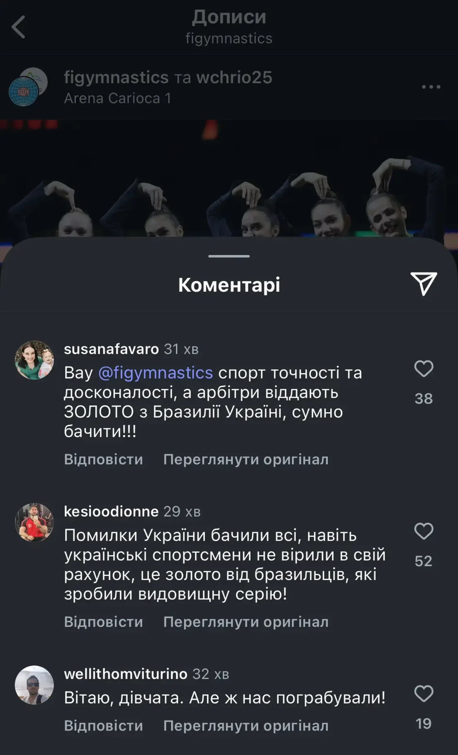 Бразильські фанати продовжують хейтити українок й у соціальних мережах. Офіційний аккаунт FIG у Instagram розмістив фото з нагородження гімнасток, під якими зібралось чимало негативних коментарів: