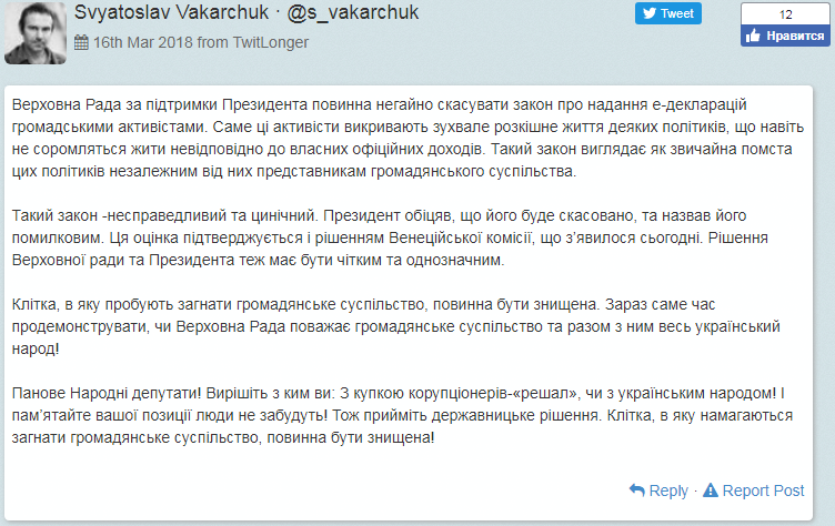 “Саме ці активісти викривають зухвале розкішне життя деяких політиків, що навіть не соромляться жити невідповідно до власних офіційних доходів. Такий закон виглядає як звичайна помста цих політиків незалежним від них представникам громадянського суспільства”, – написав Вакарчук.