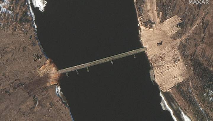 Серед іншого, повідомляється про будівництво нової дороги, і моста через річку Прип’ять на півдні Білорусі, менш ніж за шість кілометрів від кордону з Україною. Судячи із супутникових знімків Maxar і Planet Labs понтонний міст побудовано практично за одну ніч.