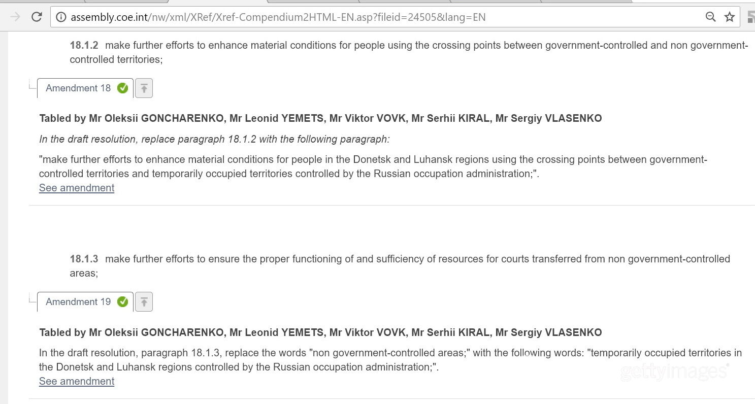 При розгляді українського блоку Асамблея майже одноголосно підтримала дві поправки, які підтверджують, що ОРДЛО є “територіями, які знаходяться під фактичним керівництвом Російської Федерації” (territories under effective control by the Russian Federation).